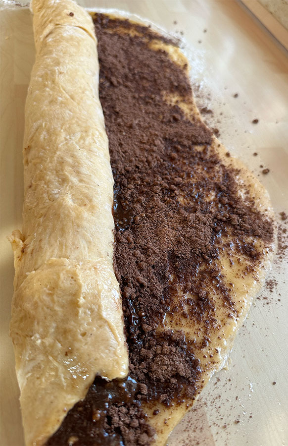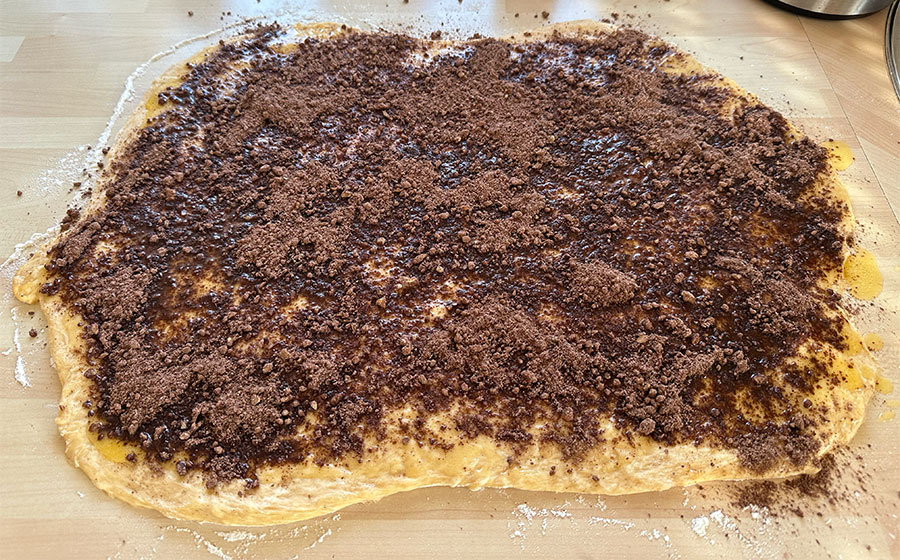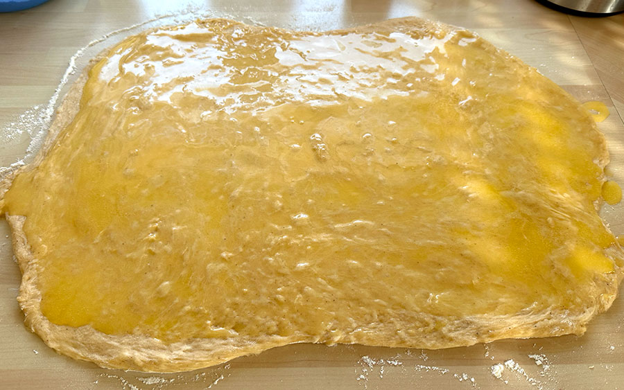 4. Den Teig ausrollen und großzügig mit flüssigem, lauwarmem Butterschmalz bestreichen. Danach mit Zimt-Zucker, Rosinen und gehackten Walnüssen bestreuen. Den Teig eng aufrollen.