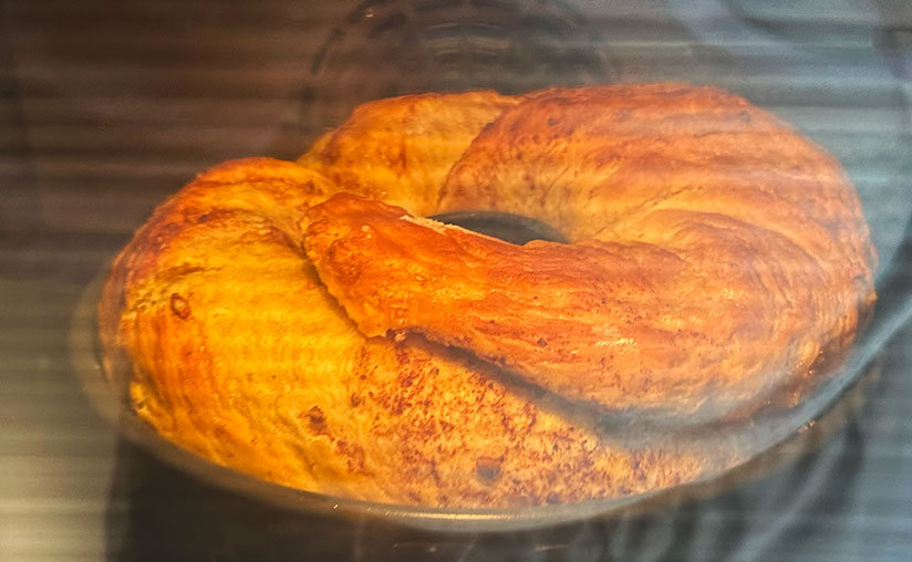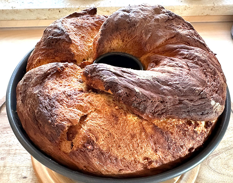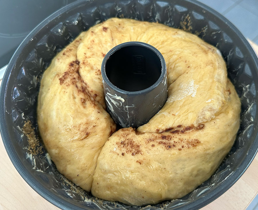 5. Aus der Rolle eine Schnecke formen und in eine gebutterte Gugelhupfform legen. Damit es im Ofen schön karamellisiert, die Form mit etwas braunen Rohrzucker bestreuen. Abdecken und erneut 30 Minuten bei Zimmertemperatur gehen lassen.